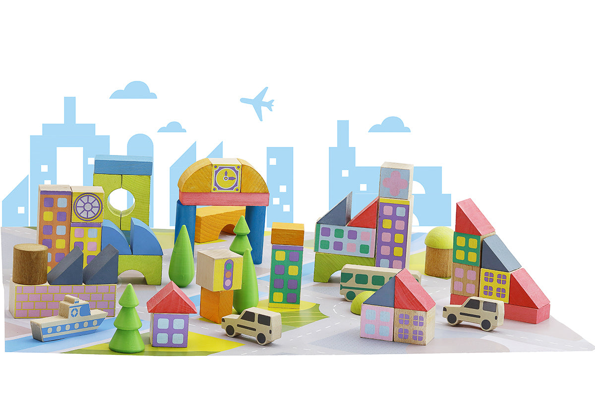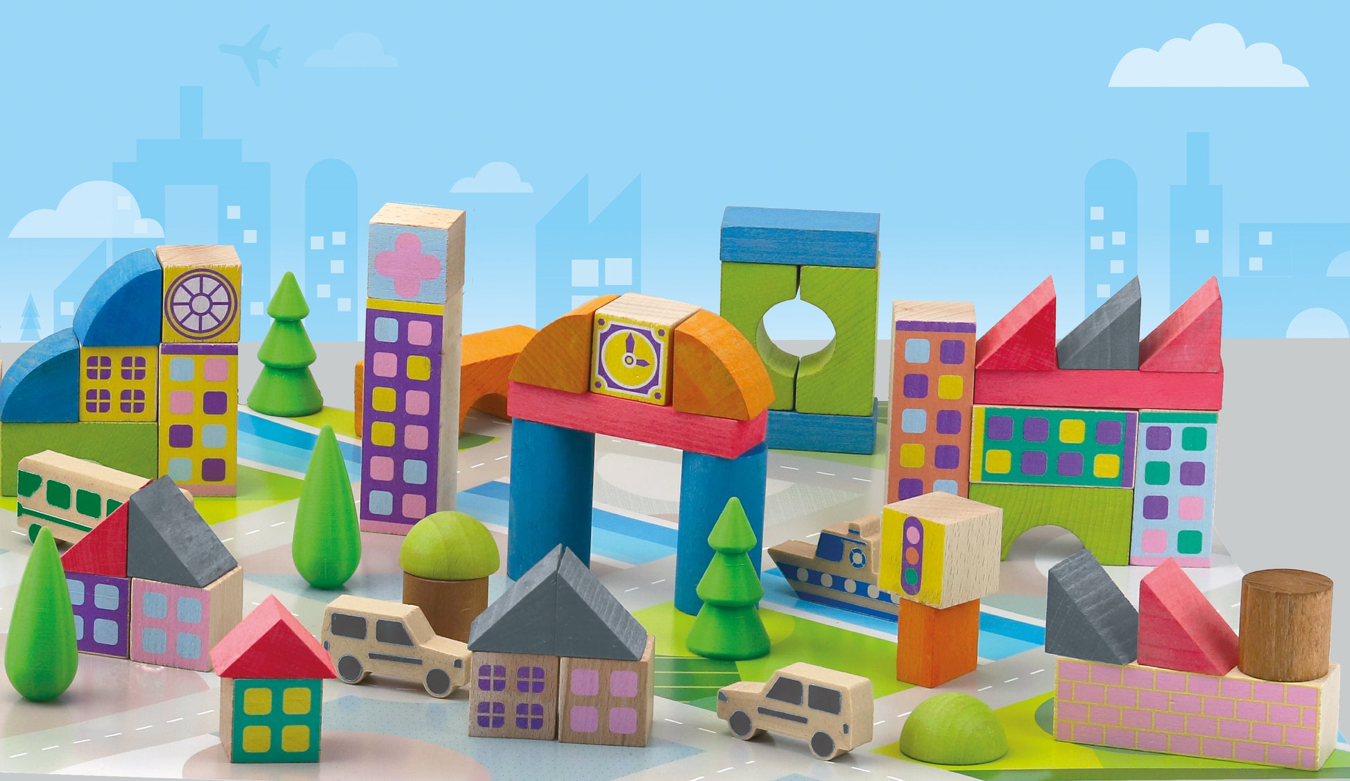 Fargerike byggeklosser med by-tema til kreativ konstruksjonslek. Materiale: Treverk. Antall deler: 50 Anbefalt alder: 2+