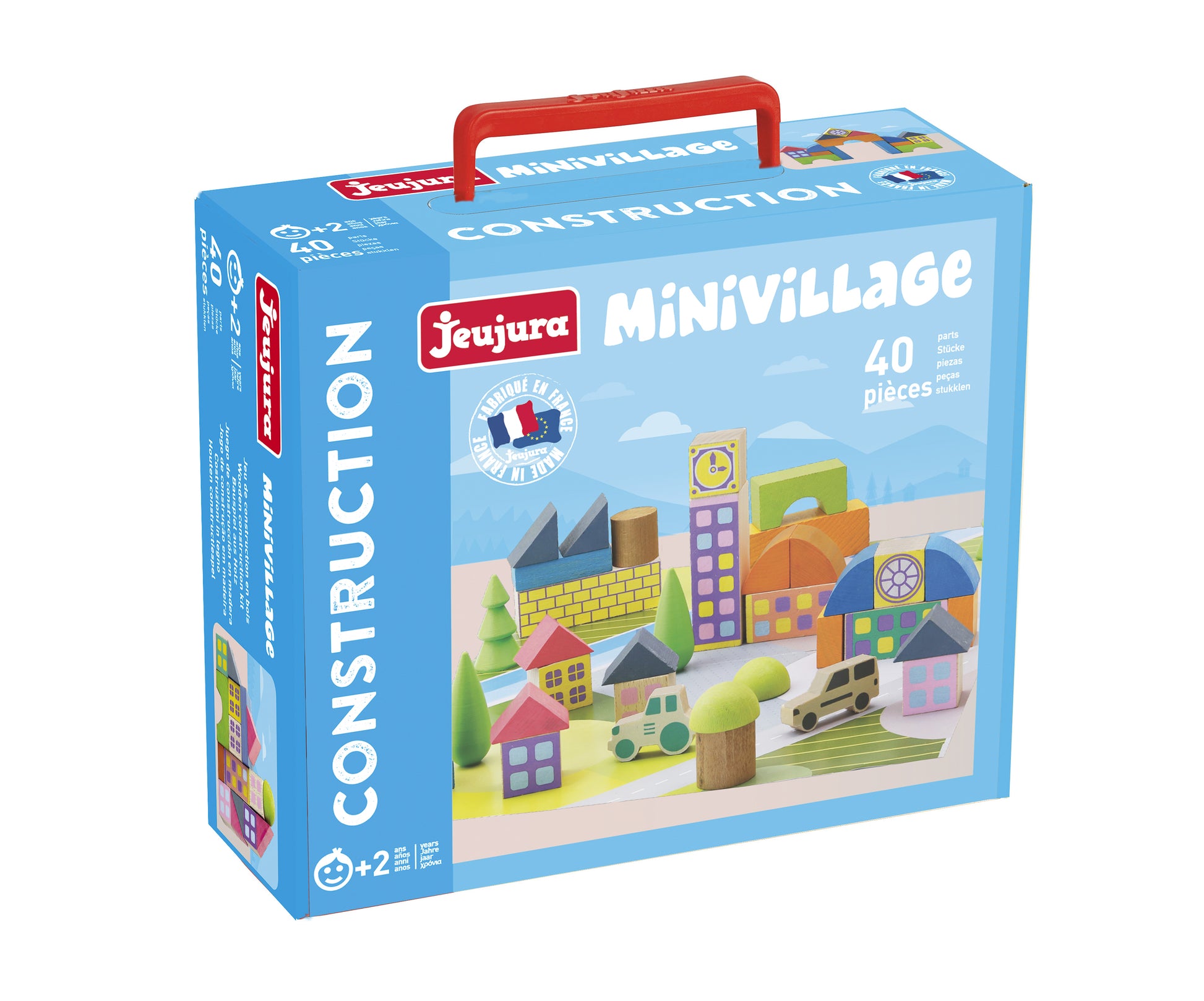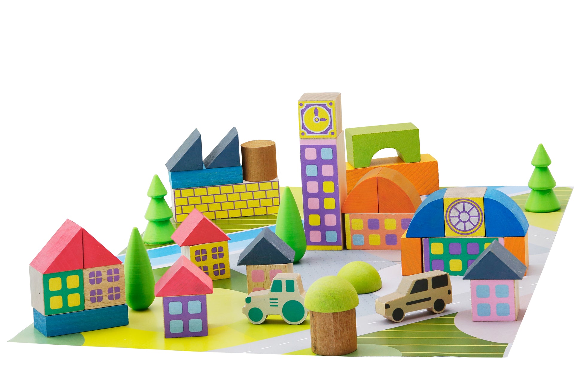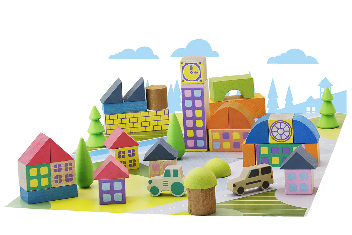 Fargerike byggeklosser med landsby-tema til kreativ konstruksjonslek. Materiale: Treverk. Antall deler: 40 Anbefalt alder: 2+