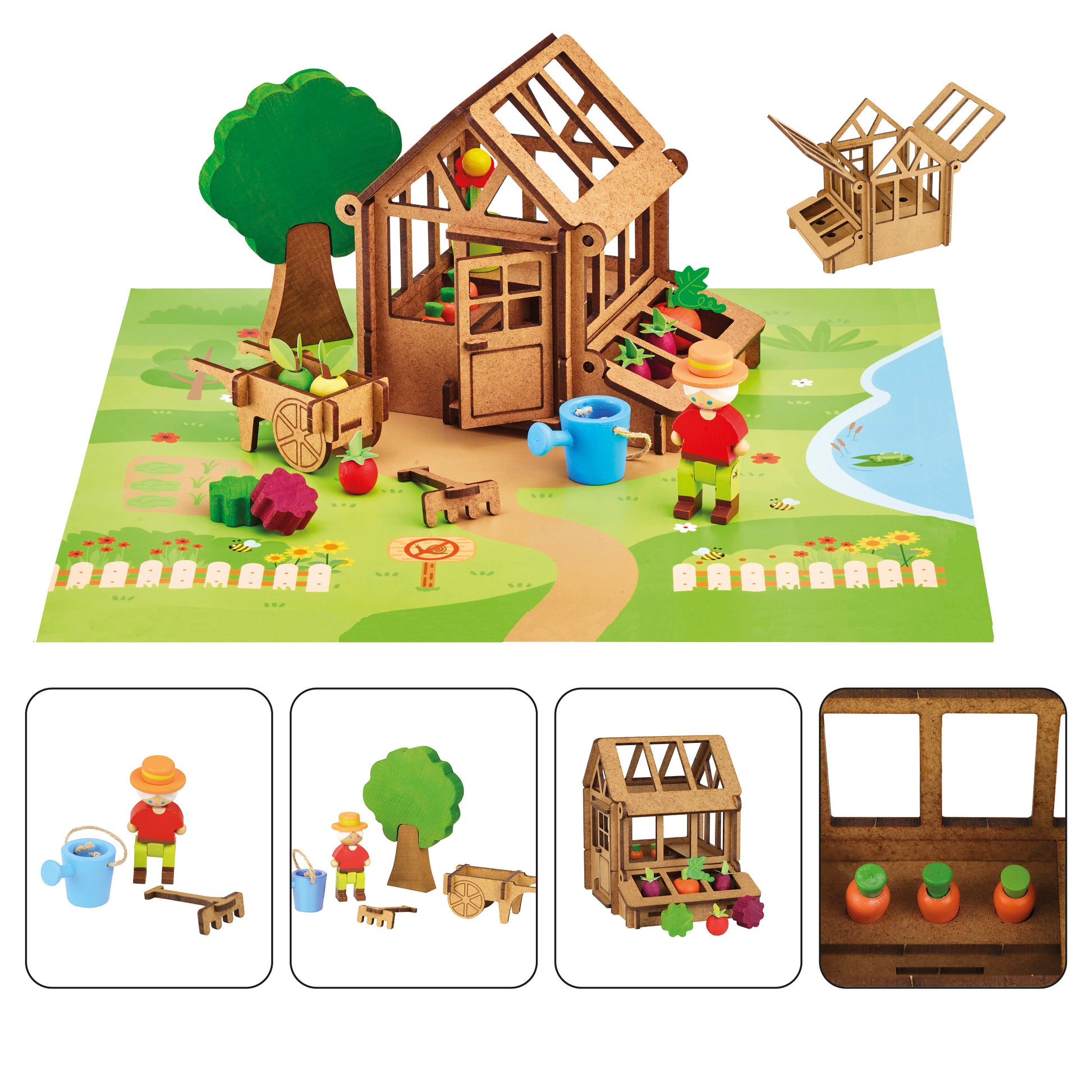 Et lyst og koselig byggesett hvor barna kan bygge sitt eget lille drivhusmiljø. Med en gartner, grønnsaker, vannkanne, tralle, rive og et stort tre er det enkelt å skape små, frodige historier. Drivhuset, trallen og riven er laget i kompakt kartong, og den tematiske underlagsmatten gjør leken komplett. Produktinformasjon: Materiale: Treverk og kompakt kartong Antall deler: 40 Anbefalt alder: 5+