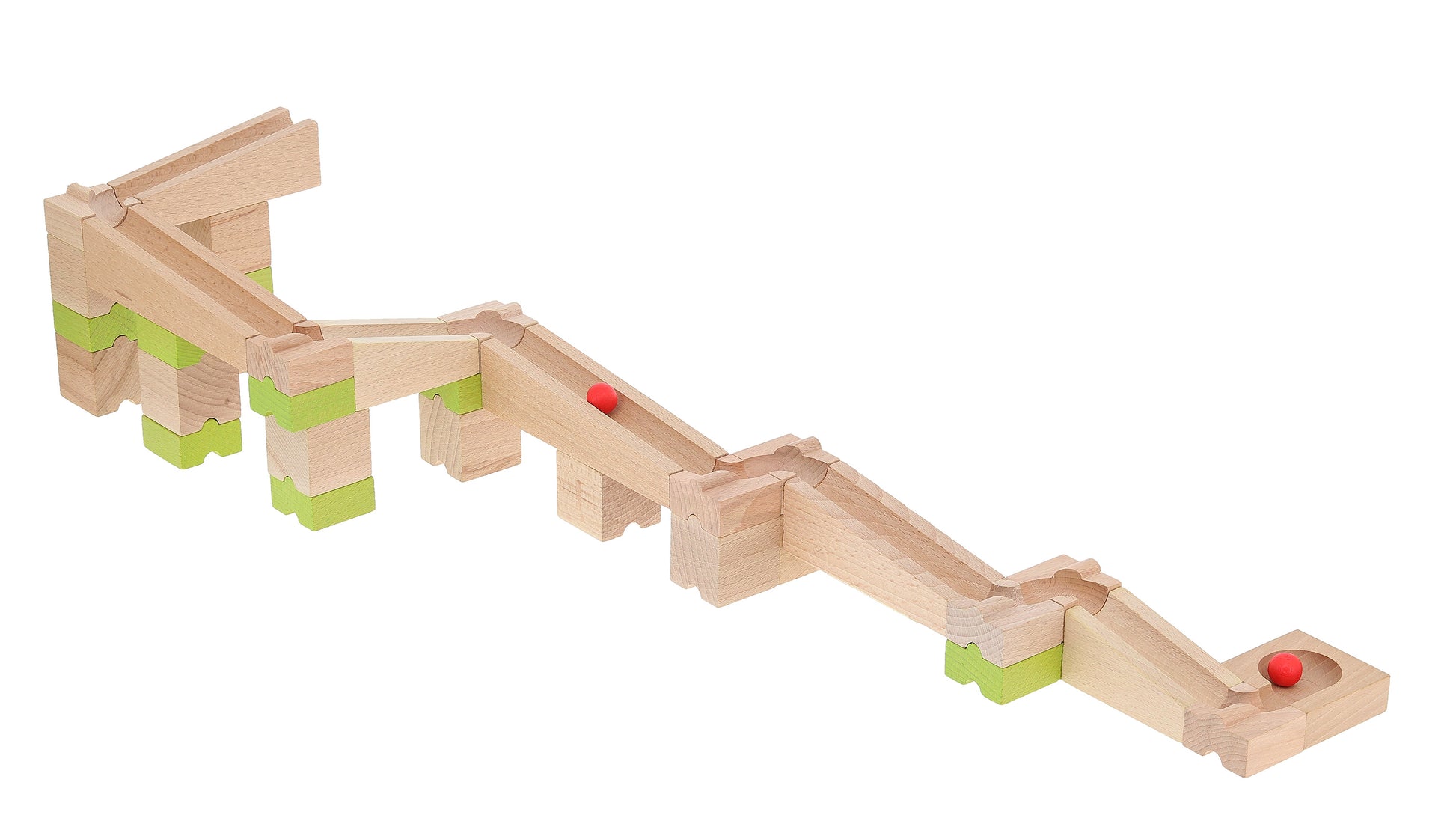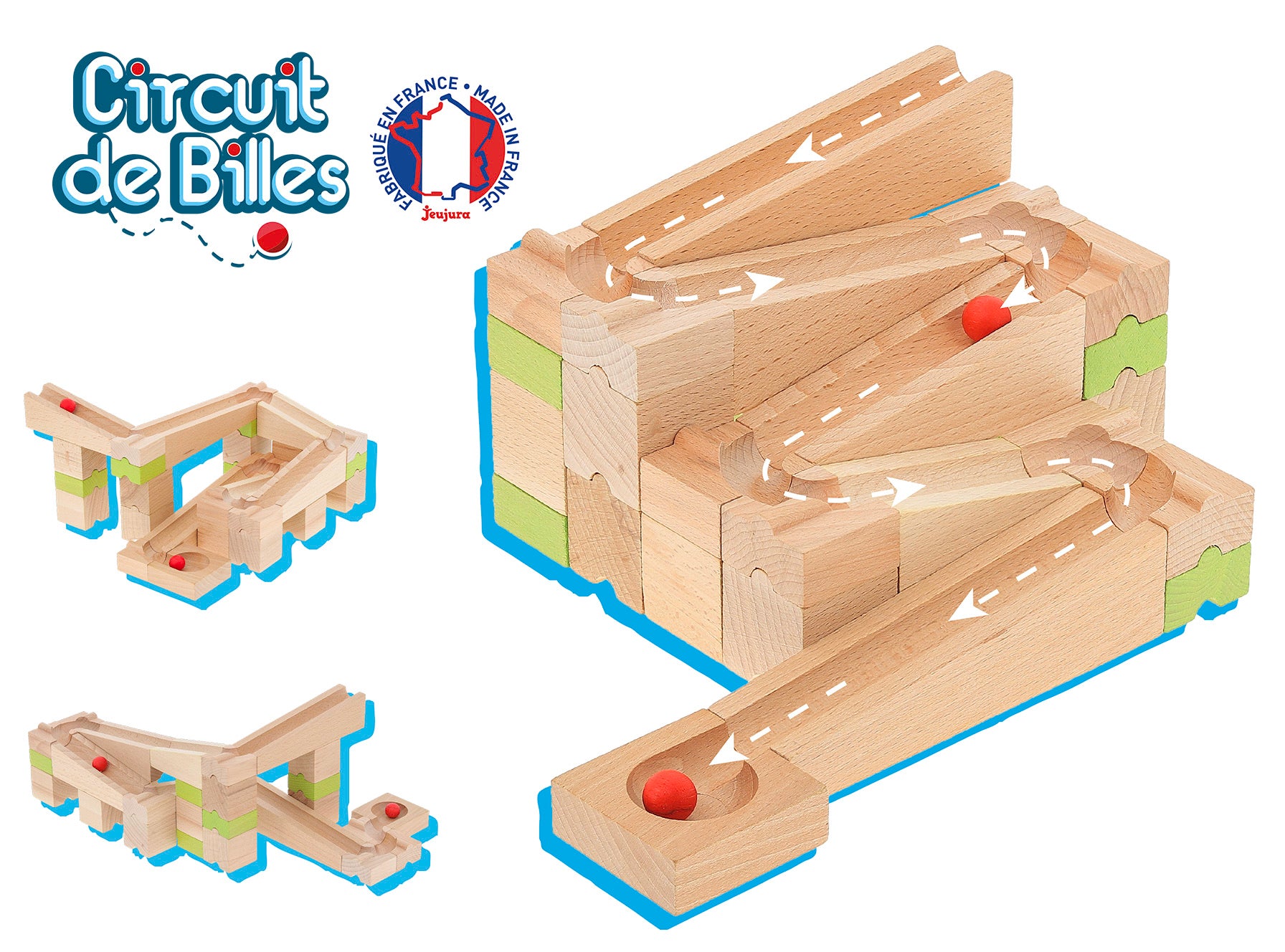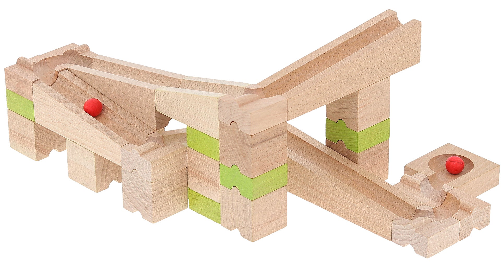 Byggesett i tre, i tre ulike farger, som utgjør ulike versjoner av en kulebane, til kreativ konstruksjonslek. Materiale: Treverk. Antall deler: 40 Anbefalt alder: 4+