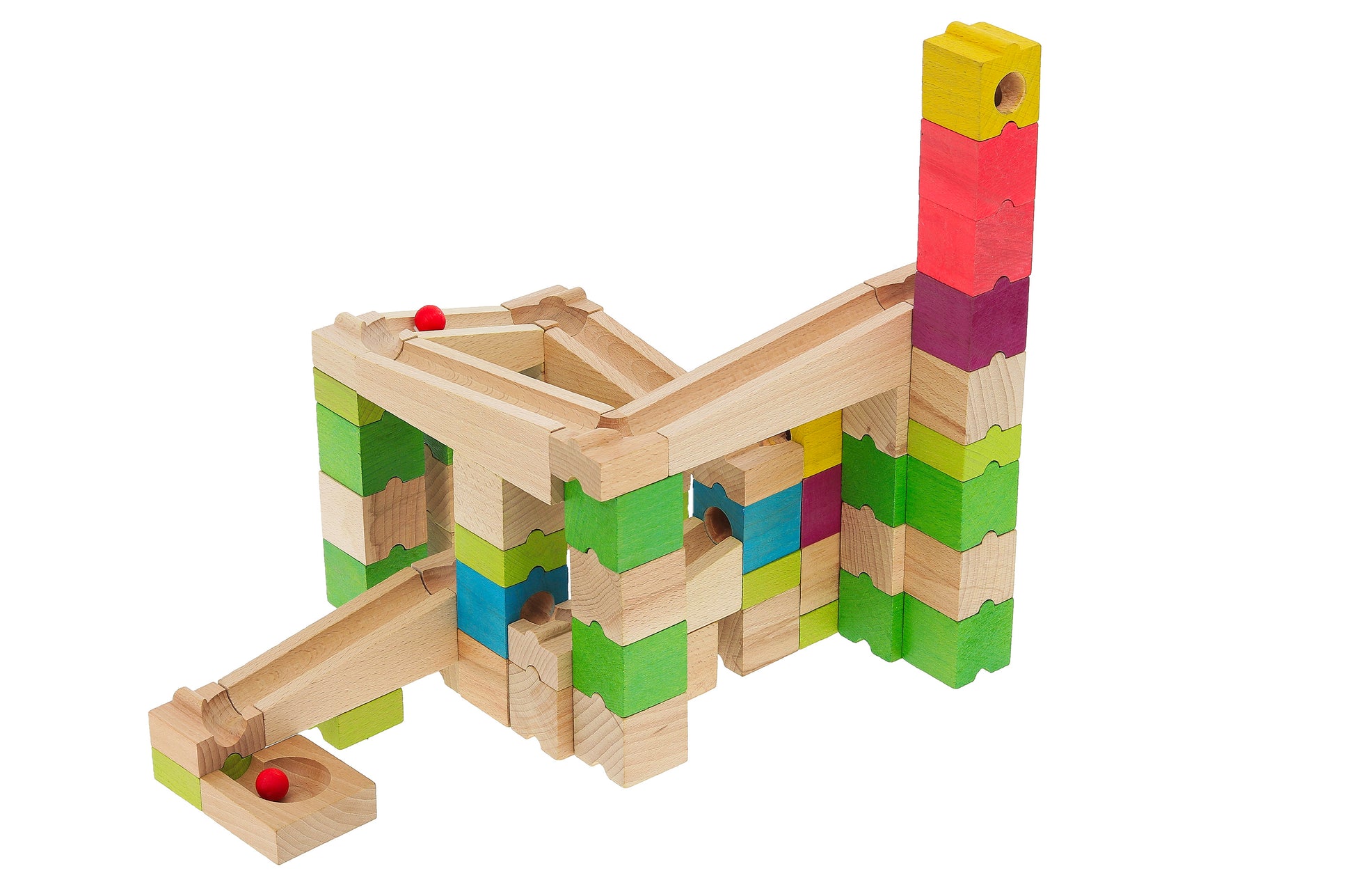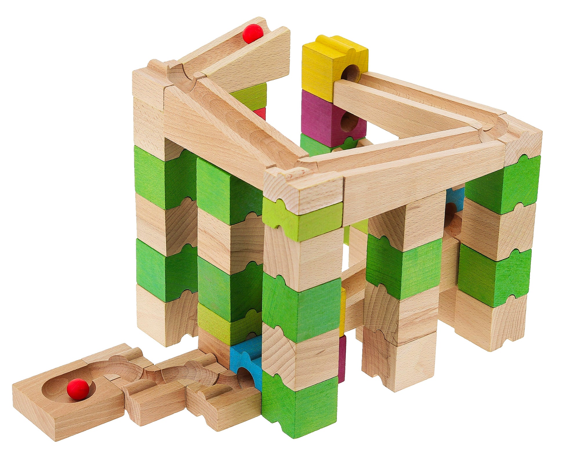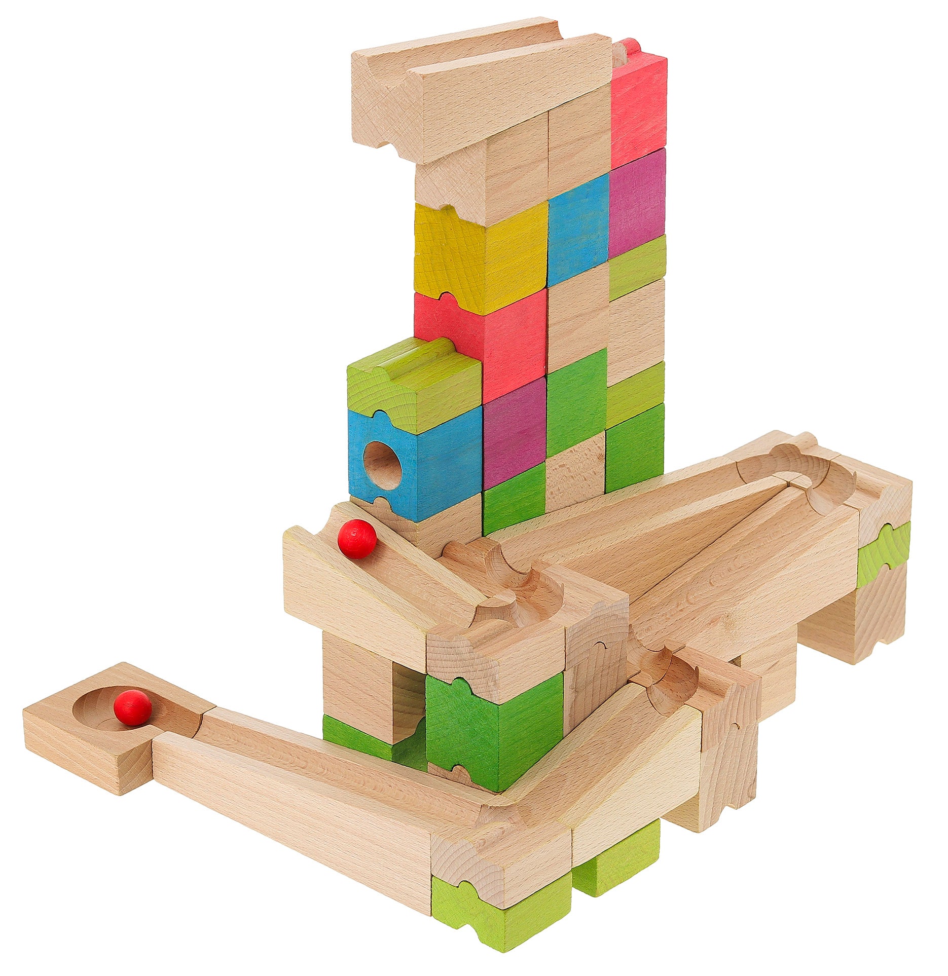 Byggesett i tre, i sju ulike farger, som utgjør ulike versjoner av en kulebane, til kreativ konstruksjonslek. Materiale: Treverk. Antall deler: 68 Anbefalt alder: 4+