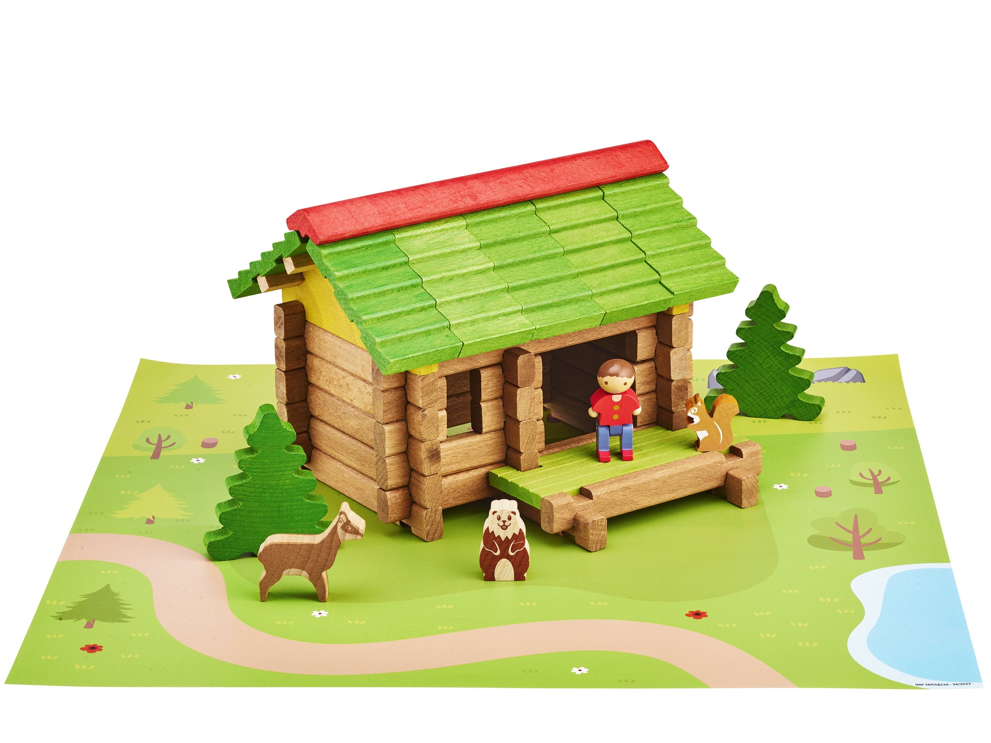 Et klassisk laftet byggesett med trebygning og tilhørende figurer som personer, dyr, natur og ulike småting. Settet inkluderer også en tematisk underlagsmatte. Materiale: Treverk. Antall deler: 60 Anbefalt alder: 3+