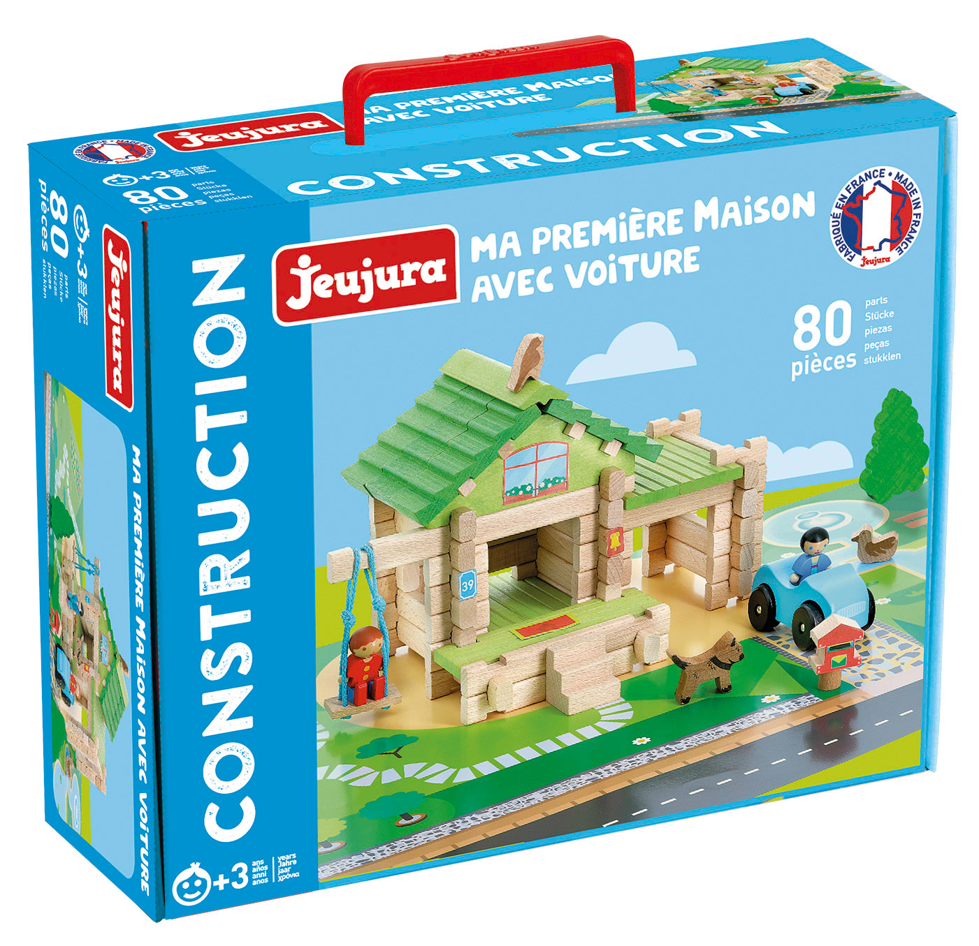 Et klassisk laftet byggesett med trebygning og tilhørende figurer som personer, dyr, natur og ulike småting. Settet inkluderer også en tematisk underlagsmatte. Materiale: Treverk. Antall deler: 80 Anbefalt alder: 3+