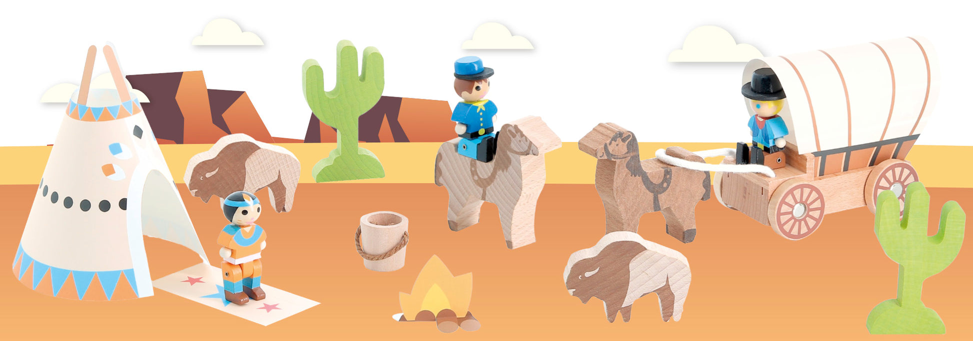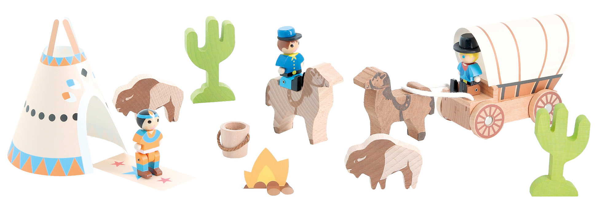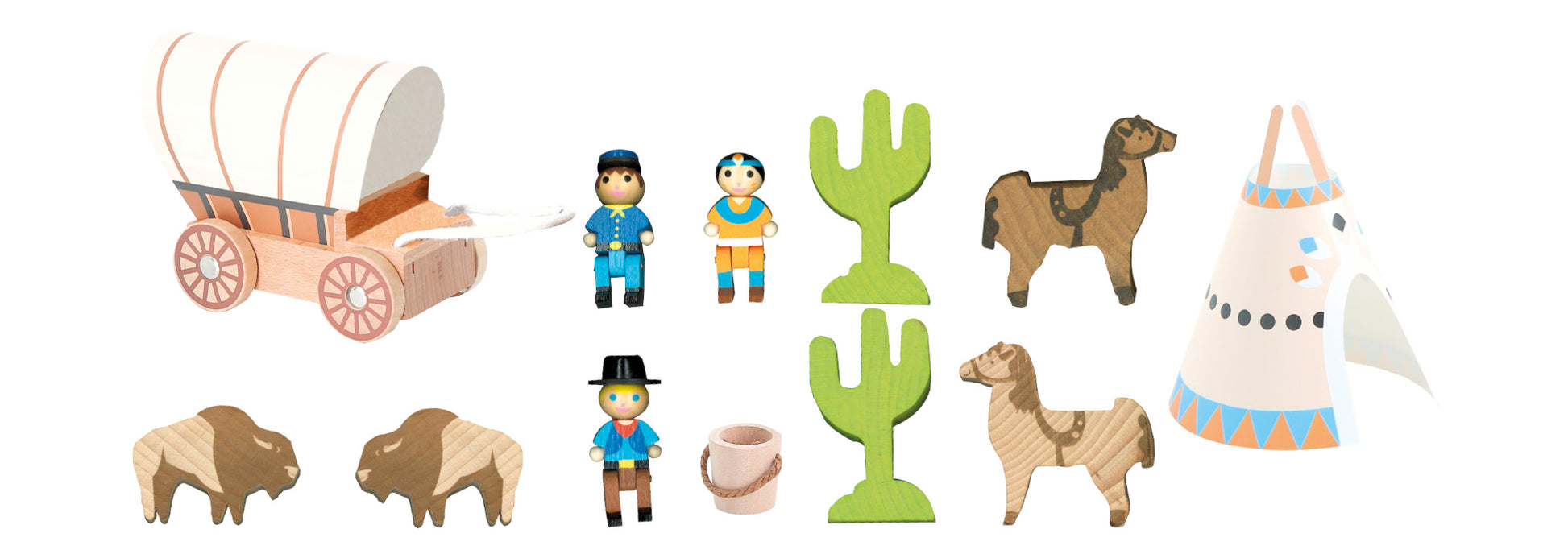 Western-tema som harmonerer med Jeujura-byggesettene, og som også kan lekes med uavhengig av noe byggesett. Materiale: Treverk. Antall deler: 12 Anbefalt alder: 3+