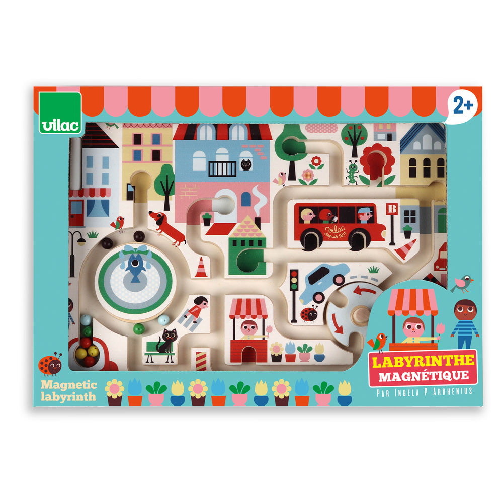 En labyrinttavle med bytema, hvor man fører magnetiske kuler gjennom labyrinten med en medfølgende magnet-penn. Materiale: Treverk. Anbefalt alder: 2+.