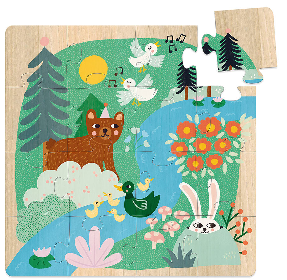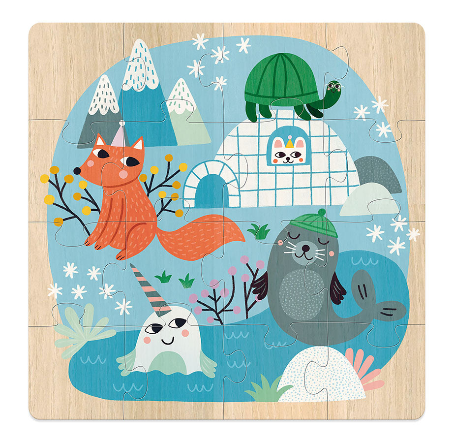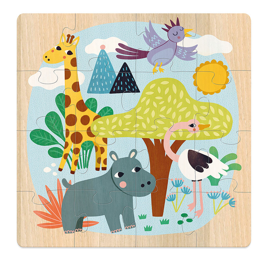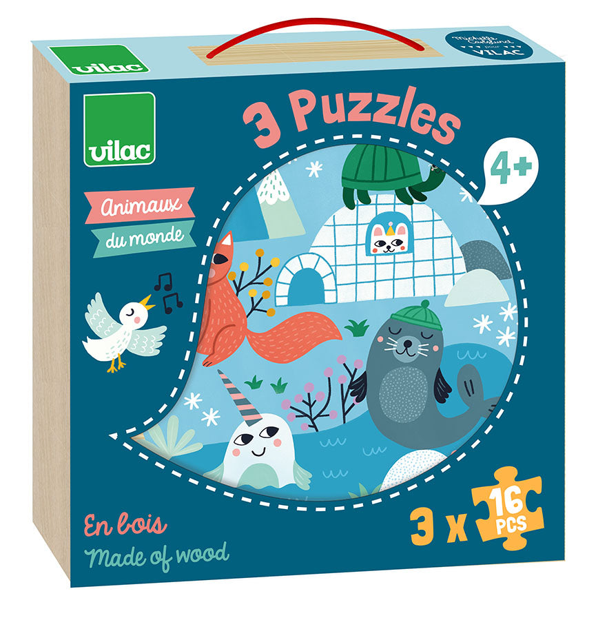 Tre puslespill med ulike motiver av verdens dyr. Materiale: Treverk. Antall deler: 3 x 16 brikker. Anbefalt alder: 4+