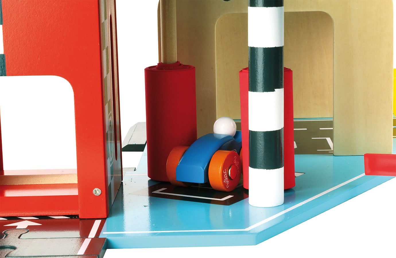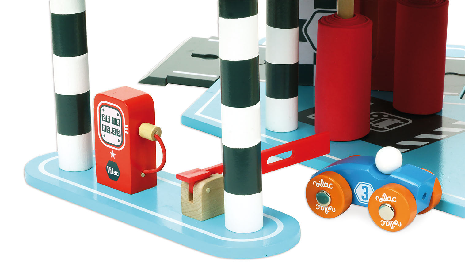 Et stort, flott og fargerikt Vilacity parkeringshus, med bilvask, verksted og bensinstasjon i bunn, to overetasjer med gode parkeringsforhold, og en gjennomgående bilheis med landingsplass til helikopter på taket. Et helikopter og to biler medfølger. Materiale: Treverk. Anbefalt alder: 3+