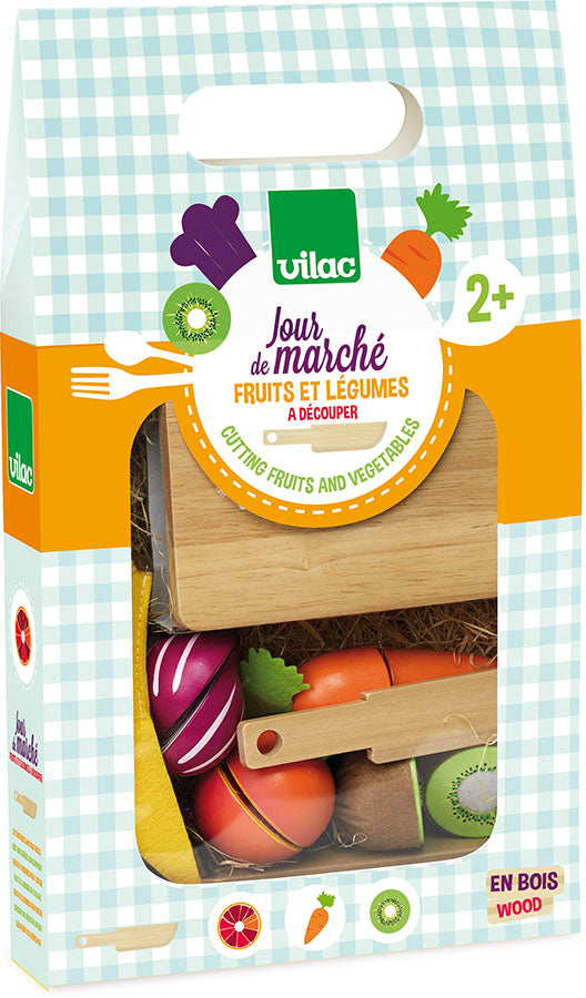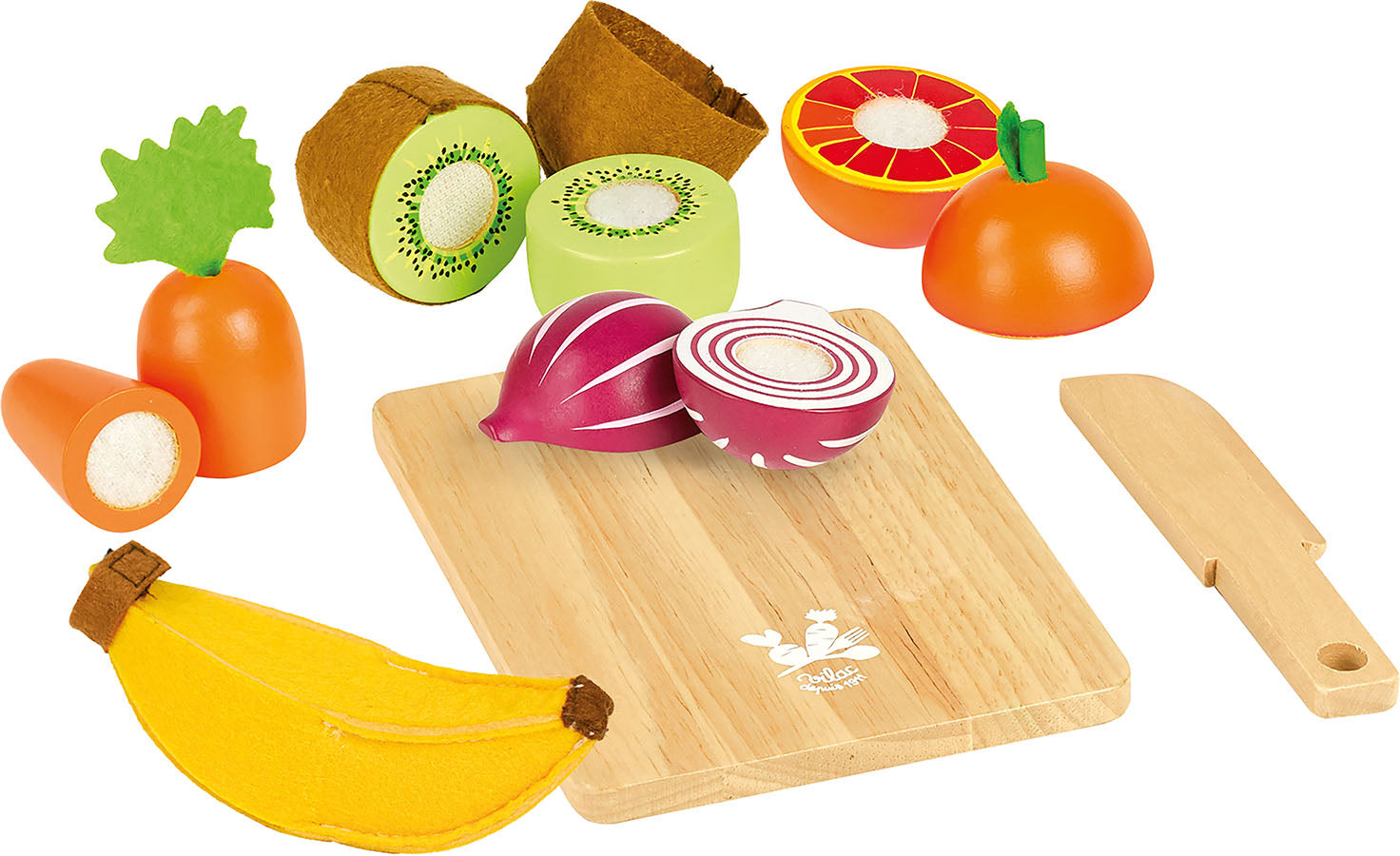 Et frukt- og grønnsakssett med tilhørende kniv og skjærefjøl. De perfekte ingredienser til en deilig middag, og en fruktsalat til dessert. Materiale: Treverk og filt. Antall deler: 7. Anbefalt alder: 2+