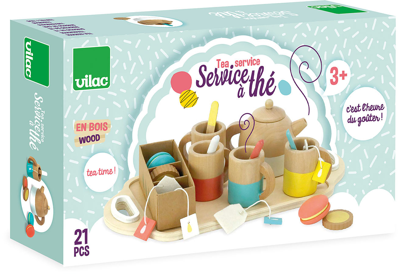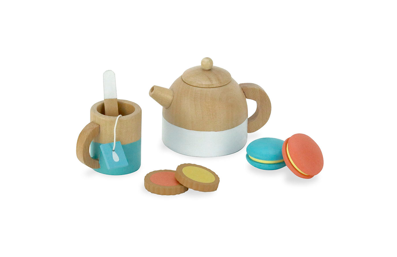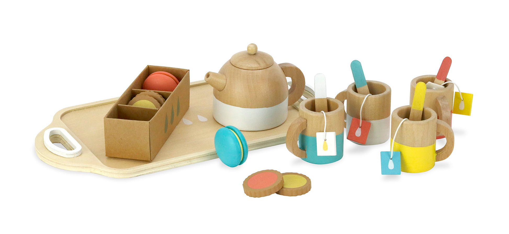 Et tesett med nydelig te og småkaker. Materiale: Treverk og filt. Antall deler: 21. Anbefalt alder: 3+