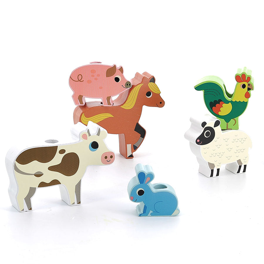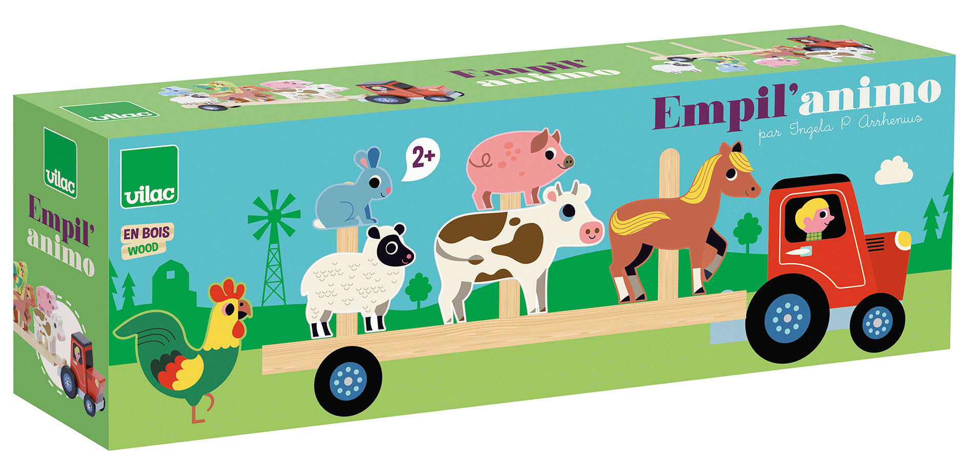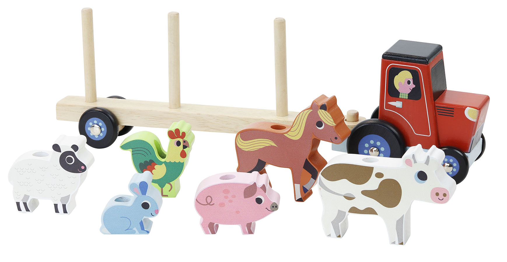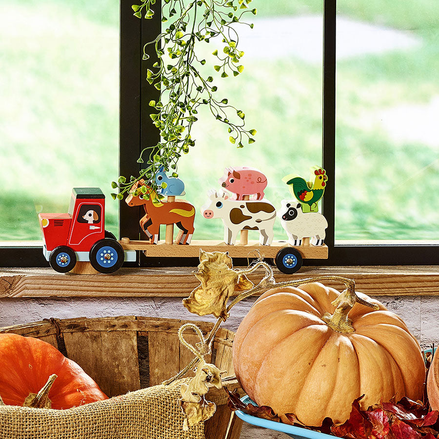En traktor med henger og seks ulike gårdsdyr som kan stables på lasteplanet. Materiale: Treverk. Anbefalt alder: 2+