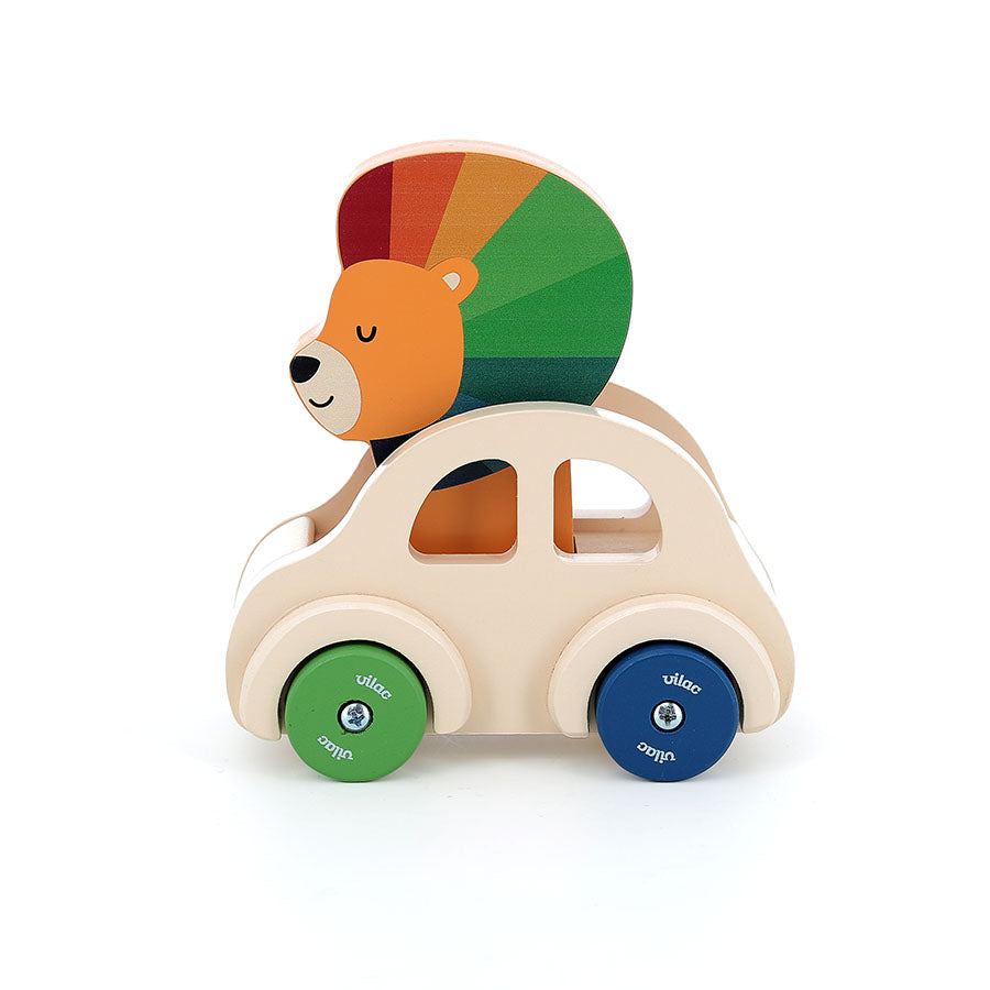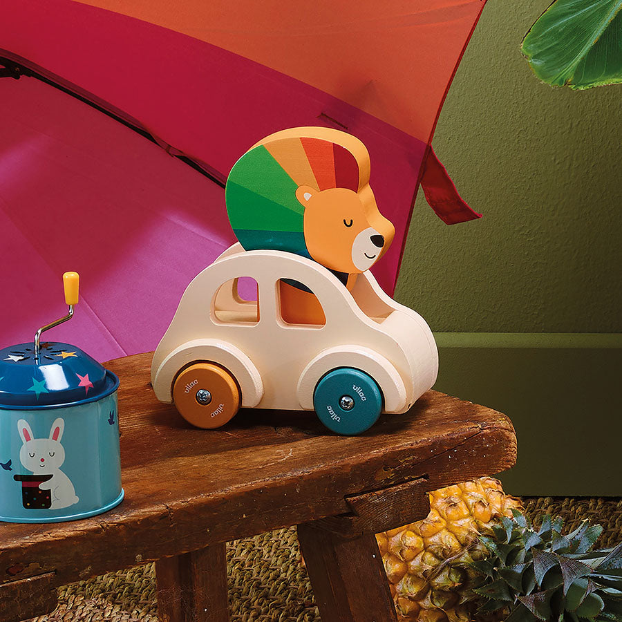 En bil med løve som lager bip-lyd når den kjører. Materiale: Treverk. Anbefalt alder: 18mnd.+