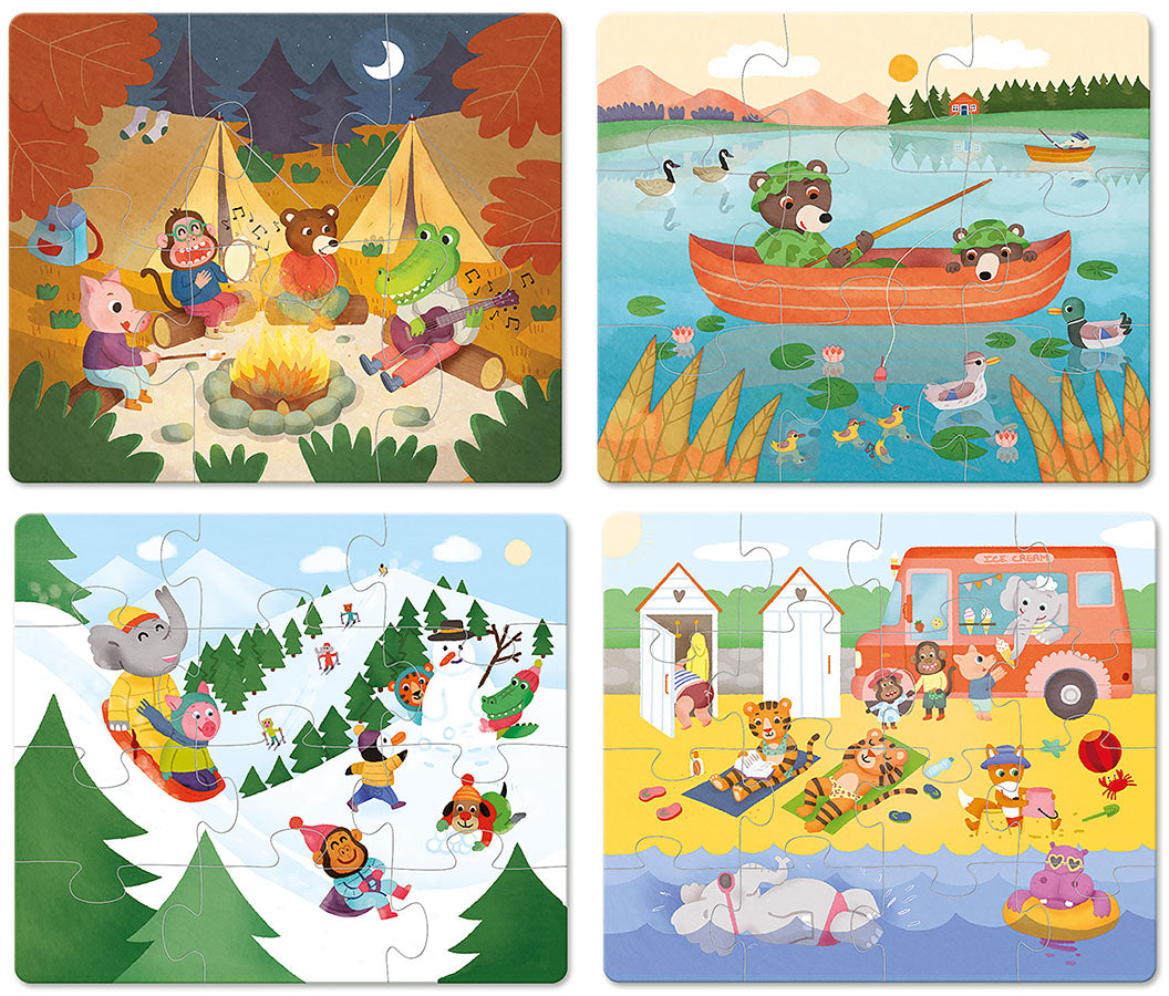 Fire puslespill med ulike feriemotiver. Materiale: Treverk. Antall deler: 4 x 6, 9, 12 og 16 brikker. Anbefalt alder: 2+