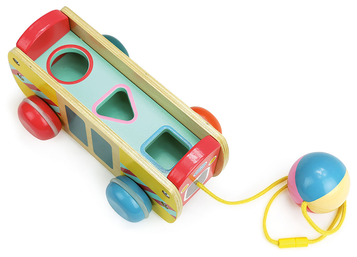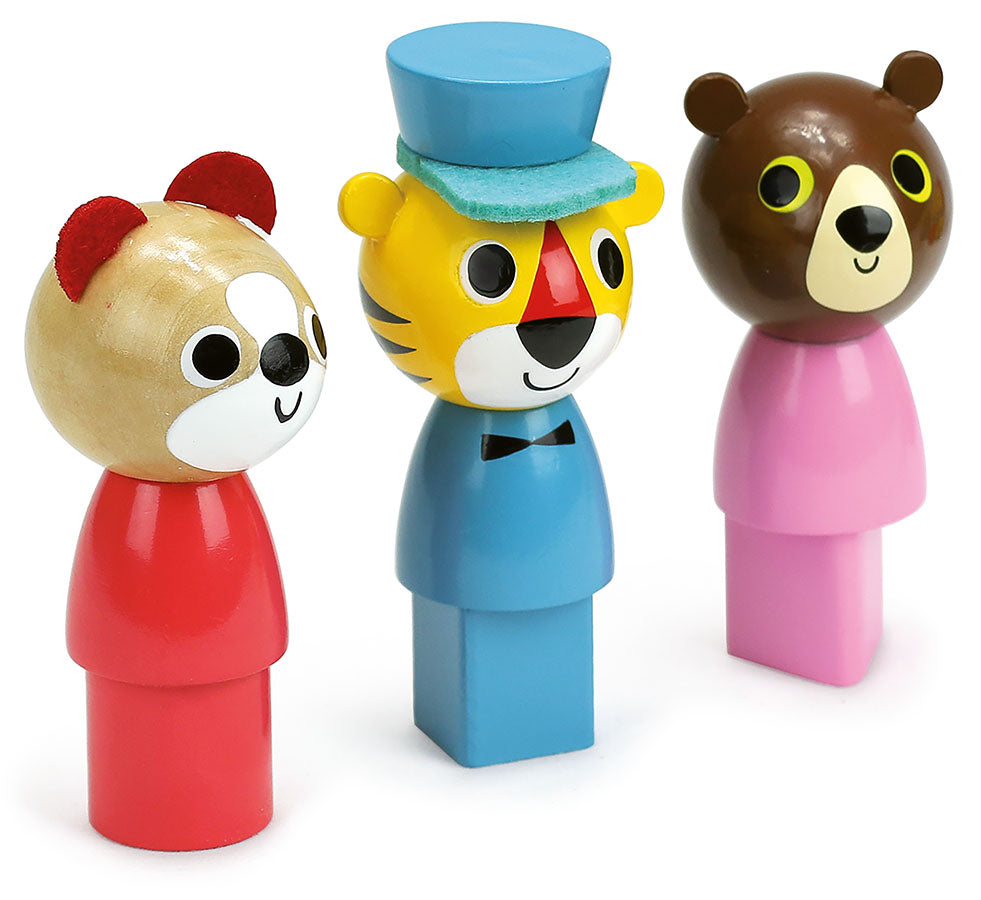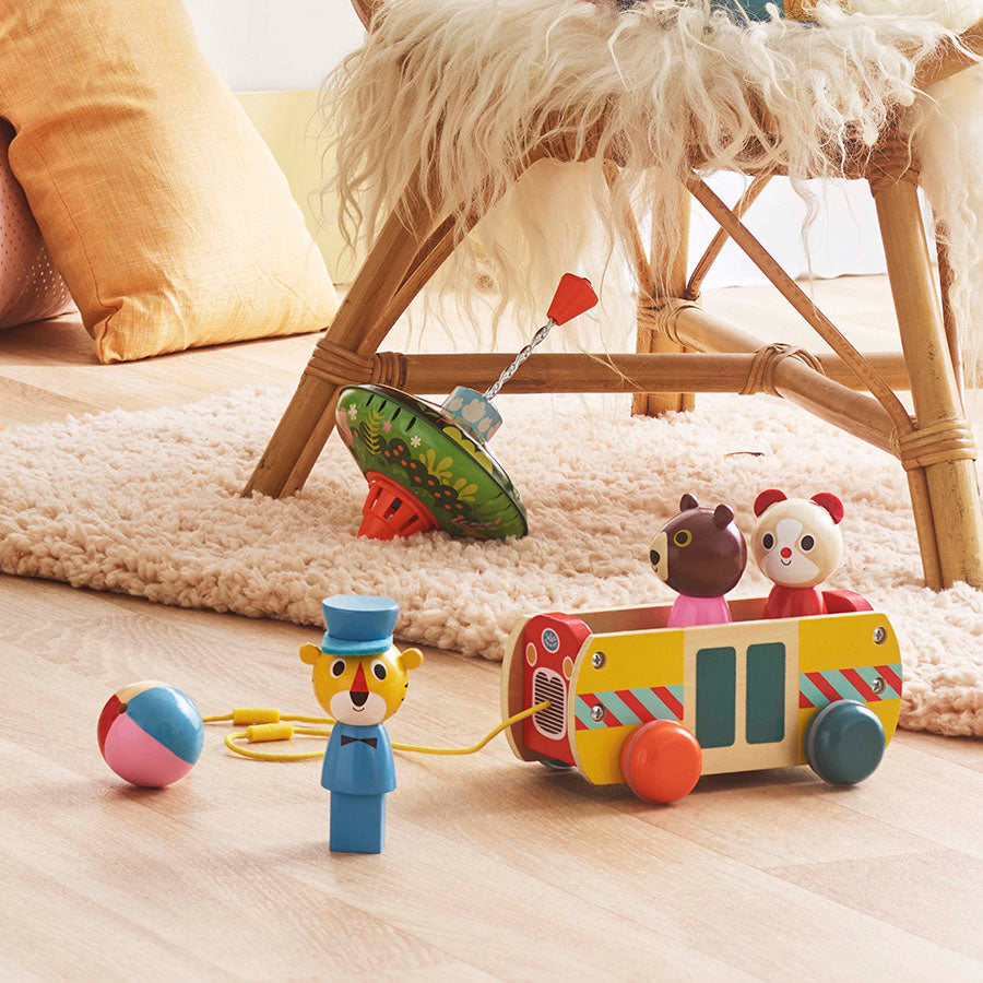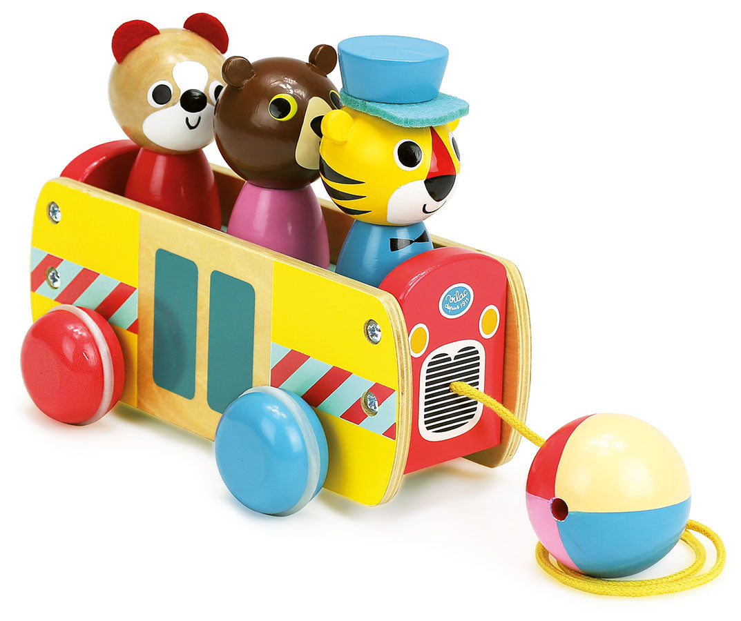 En vogn som kan trekkes, med tre figurer som kan tas ut og som må settes tilbake på rett plass. Materiale: Treverk. Anbefalt alder: 1+